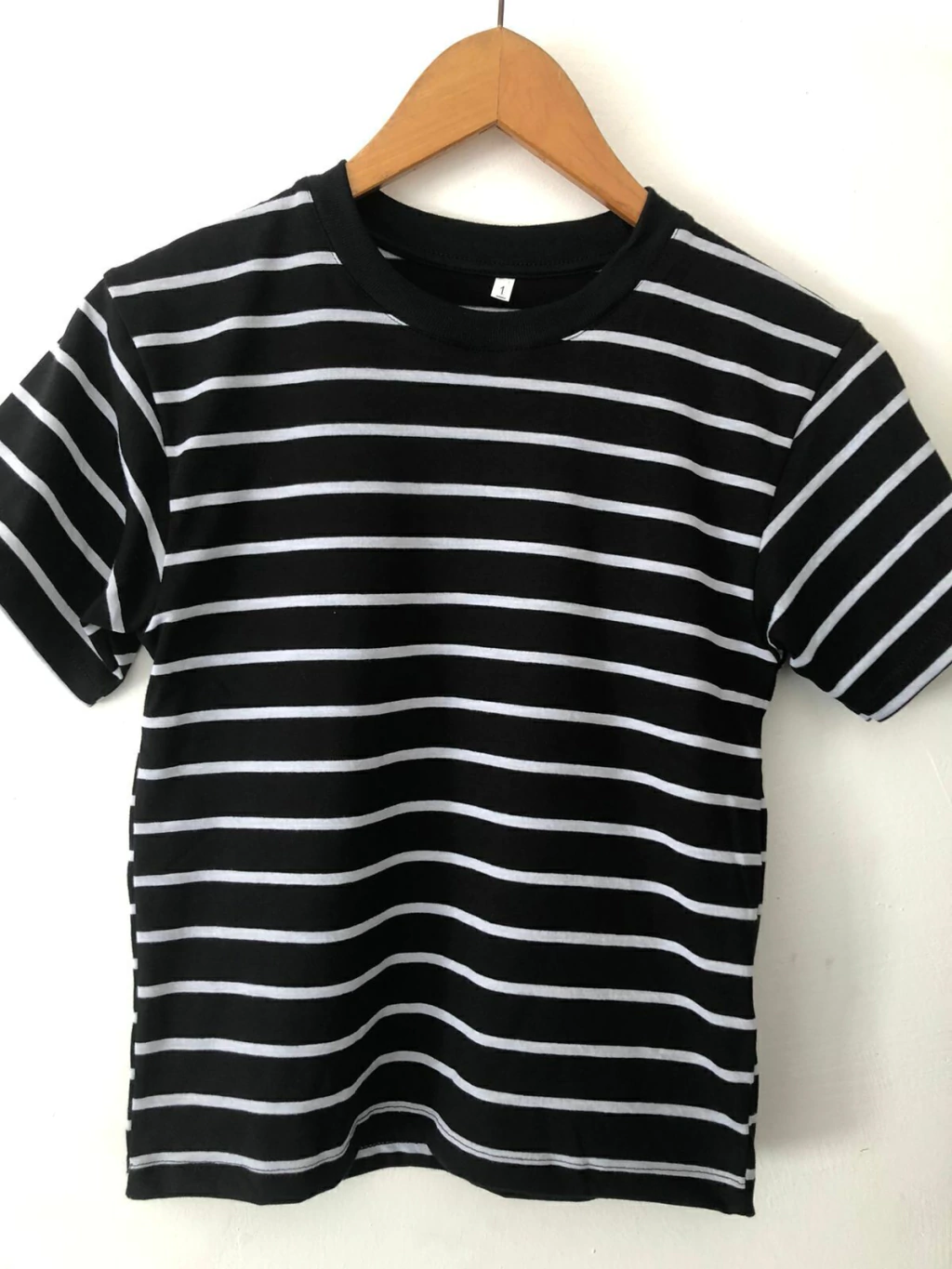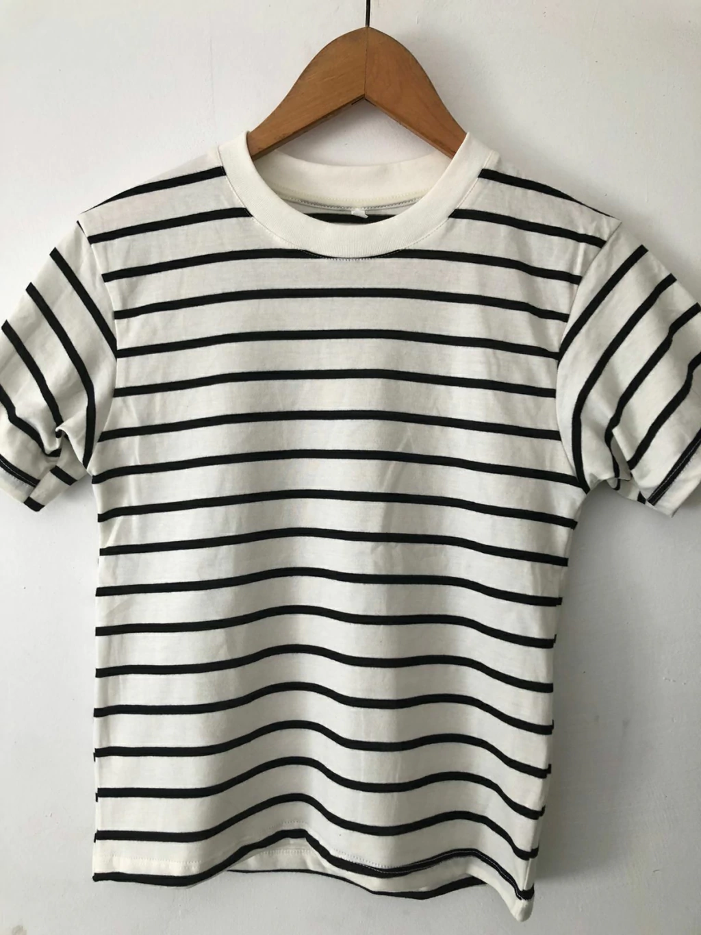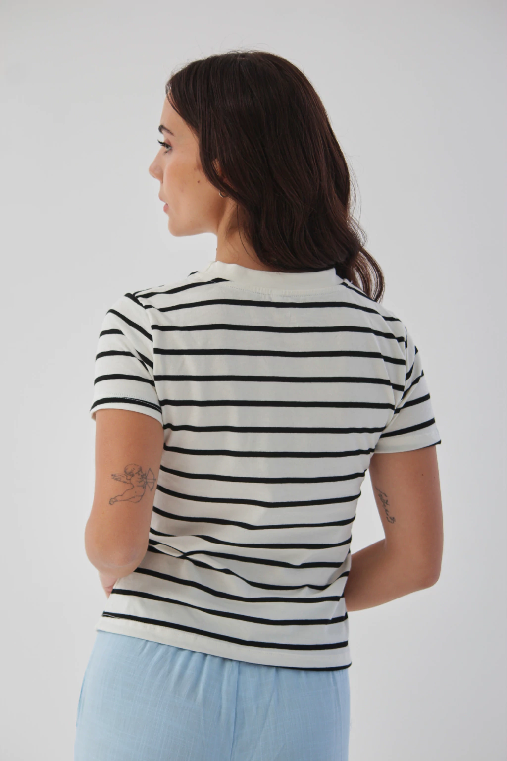 Remera con moldería al cuerpo confeccionado en algodón rayado, tiene cuello redondo con ribb.